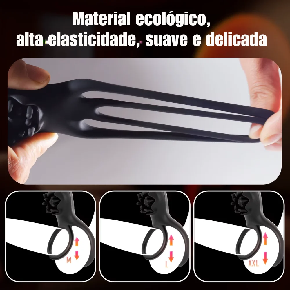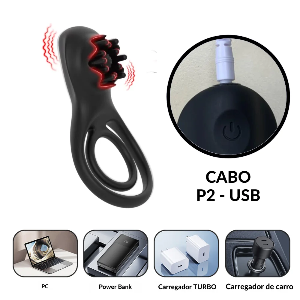 Dispositivo desenvolvido para estimulação masculina, com foco na glande, combinando vibração localizada e anel peniano elástico para melhor fixação e estabilidade durante o uso. A extremidade superior possui módulo vibratório com múltiplos pontos de contato em relevo, projetados para estimular a glande de forma concentrada e uniforme. O sistema de vibração atua por pulsos rítmicos, proporcionando estímulos precisos e controlados. O anel peniano integrado apresenta alta elasticidade, permitindo adaptação a diferentes medidas, sem comprometer o conforto. Sua função é auxiliar na fixação do produto e contribuir para maior estabilidade durante a estimulação.