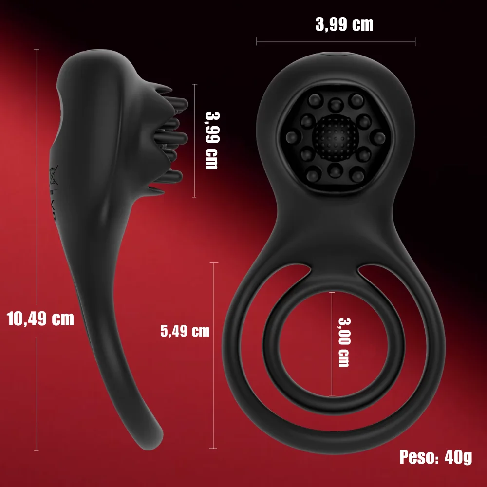 Medidas: Diâmetro da área estimuladora: 3,99 cm – Comprimento total: 10,49 cm – Comprimento do corpo inferior: 5,49 cm – Diâmetro interno do anel: 3,00 cm – Peso: 40 g