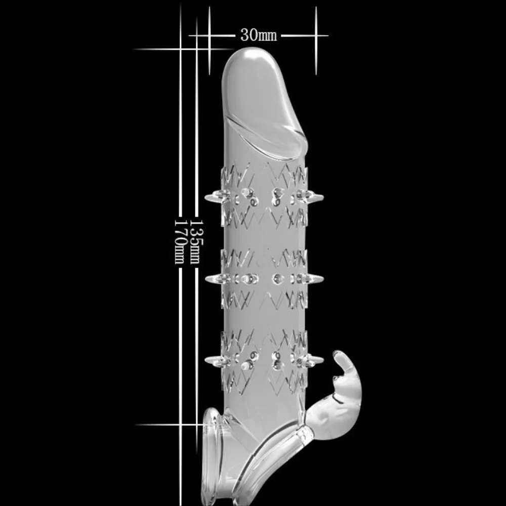 Capa peniana formato de glande em silicone flexível, possui textura, relevos e saliências massageadoras.