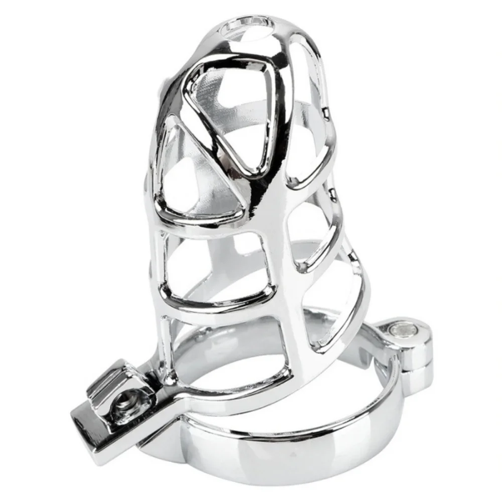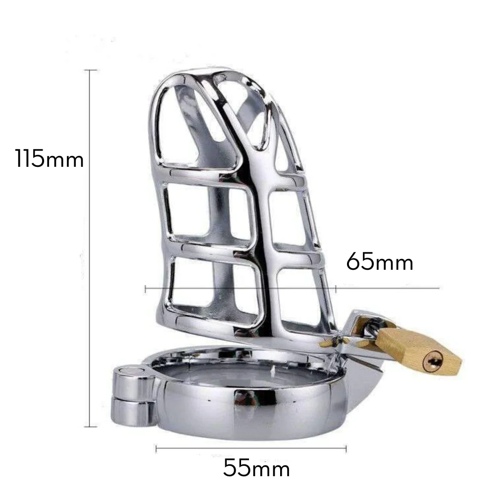 Cinto de castidade masculino em formato de gaiola em aço. Possui argola para o escroto e abertura vazada.