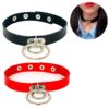 Coleira bondage ajustável por meio de fivelas metálicas, confeccionada em couro sintético.