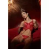 O conjunto é composto por duas peças em renda preto. O sutiã tem modelo meia-taça com aro, sem bojo, todo em renda transparente, com alças finas ajustáveis e detalhes delicados nas bordas. A calcinha é um modelo ousado, com recortes e tiras finas que criam um design geométrico e sensual na parte frontal. A renda vermelha traz um ar de sofisticação e sensualidade, enquanto as tiras estratégicas dão um toque moderno e provocante ao conjunto. É uma lingerie que combina elegância com um estilo mais ousado e marcante.