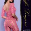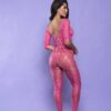 Macacão bodystocking em tecido tipo meia-calça, modelo arrastão trama grande.
