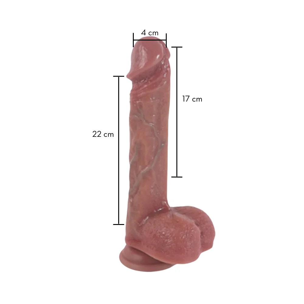 Pênis Realístico com glande, veias reais, escroto e ventosa, acompanha controle remoto. Possui função de aquecimento para imitar a temperatura corporal, proporcionando uma experiência mais realista.