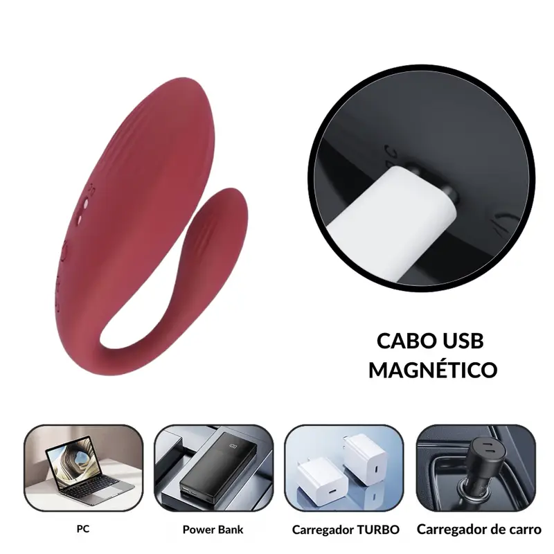 Vibrador duplo em silicone por aplicativo, flexível e anatômico, que estimula clitóris e ponto G ao mesmo tempo.